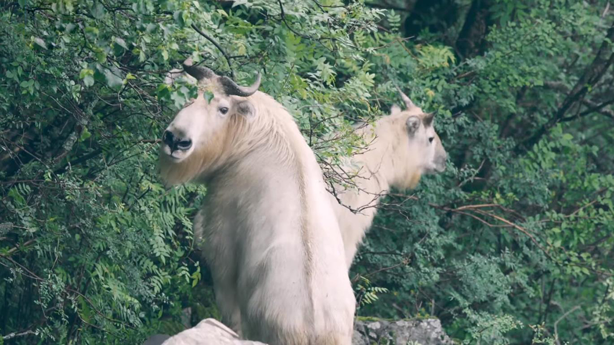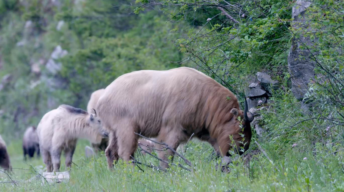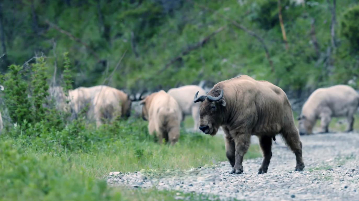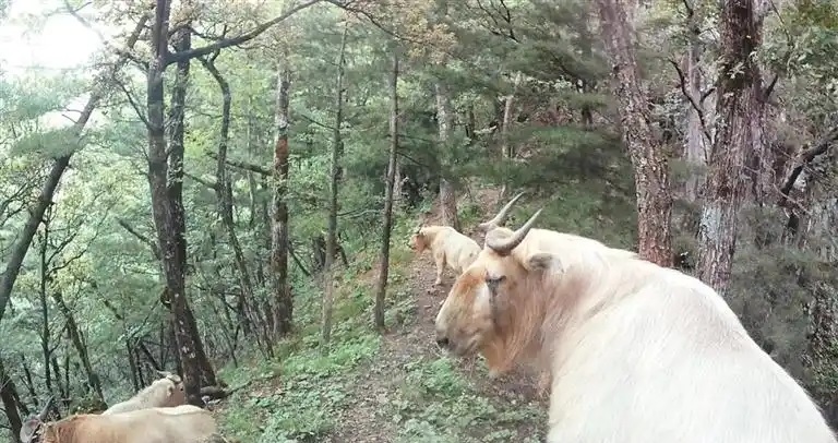 画面中这些羚牛身上的毛发通体黄白色,可以看出来属于秦岭羚牛。秦岭羚牛是四种羚牛里面颜值最高的,其他的羚牛亚种,身上的毛发会掺杂着一些不规则的深褐色,多多少少影响了颜值。