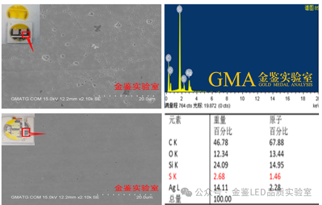 进一步对试验后的A、B灯珠采用机械方法开封后,对镀银层SEM—EDS分析,结果同样显示A款灯珠镀层被硫化腐蚀严重,出现硫化银结晶颗粒和腐蚀空洞;而B款灯珠镀银层表面相对光整,受腐蚀情况较轻微。综上,可得知B款灯珠抗硫化能力明显优于A款灯珠。发生硫化腐蚀后的LED表现为支架功能区发黑,光通量严重下降,色温出现明显漂移,使整个产品的寿命和可靠性大大降低。诚然,LED光源产品所处的生产、存储、使用等环境或接触的有害物料是导致其硫化变色失效的最直接原因,但是,除开外部客观原因,我们总希望自己的产品或选用的光源同时具有较强的抗硫化腐蚀能力,使器件具有较长的使用寿命和较高的可靠性,以在激烈的市场竞争中提高产品的竞争力。