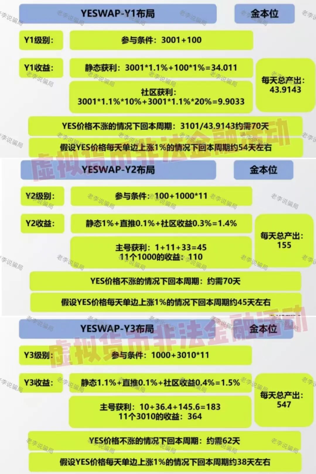 以发行虚拟代币“YES”为核心,通过“公募质押”吸引用户投资,设置Y1、Y2、Y3不同层级的参与资金门槛,收益模式分为静态固定返利、拉新层级收益,还以“代币价格单边上涨”为噱头承诺缩短回本周期。