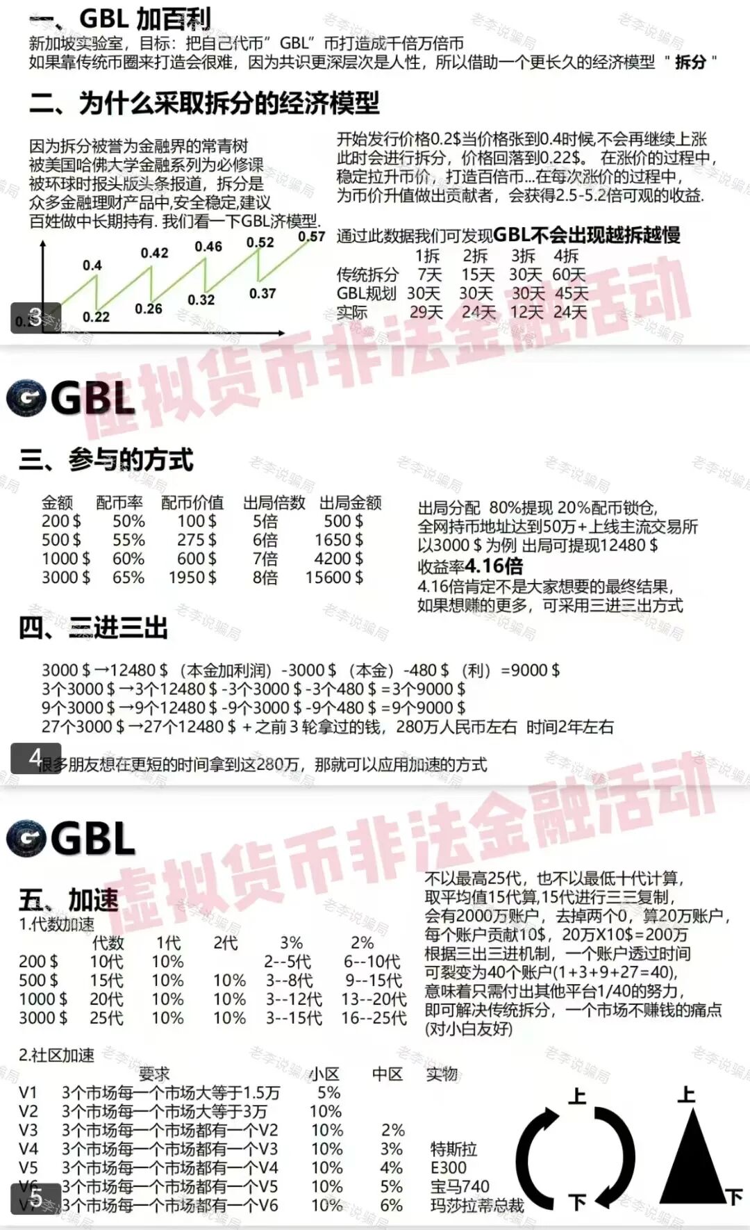 宣称来自一家新加坡的公司,推出“GBL加百利”虚拟代币,采用“拆分”模式发展下线,号称参与者投资可获得最低静态2.5-5.2倍收益,发展下线可以获得最高15代动态收益。