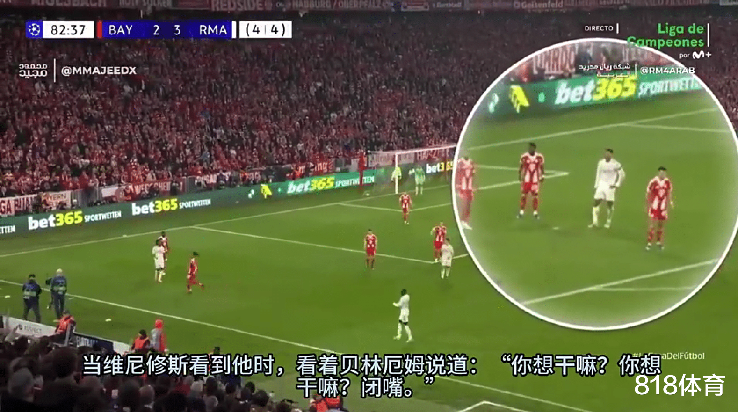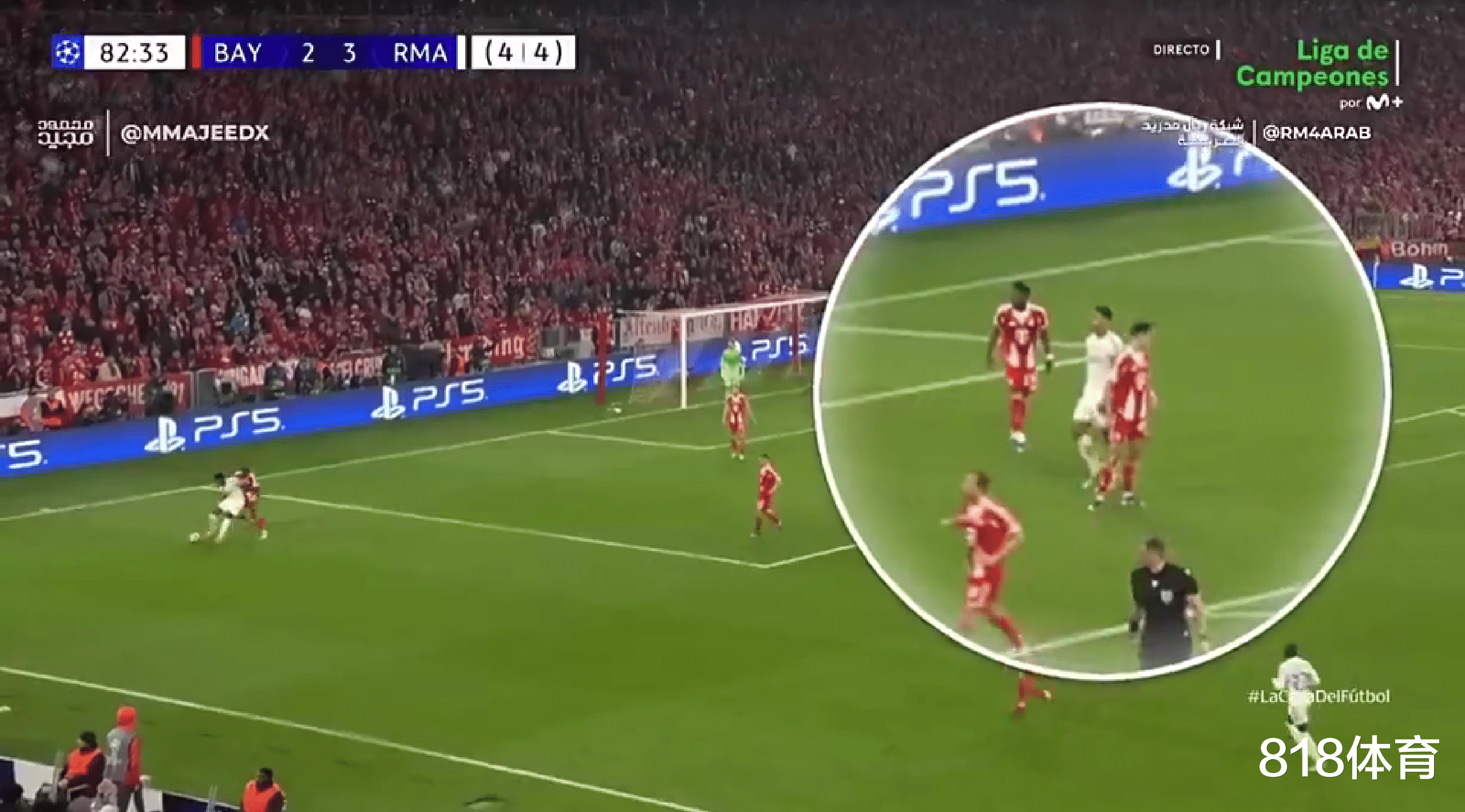 当时比赛进行到第82分钟,双方总比分4-4平,局势十分胶着,只要拜仁进球皇马随时会被淘汰出局。