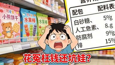“妈妈我要吃那个小熊饼干!”—— 你是不是经常在超市被娃的 “撒娇攻击” 打败?但某母婴测评机构卧底发现:货架上标着 “儿童专用” 的零食,60% 含糖量超标(某款儿童饼干每 100g 含糖 25g,≈6 块方糖),还有的偷偷加了防腐剂和人工色素。家长群里吐槽:“花高价买的‘健康零食’,结果比辣条还坑娃。”