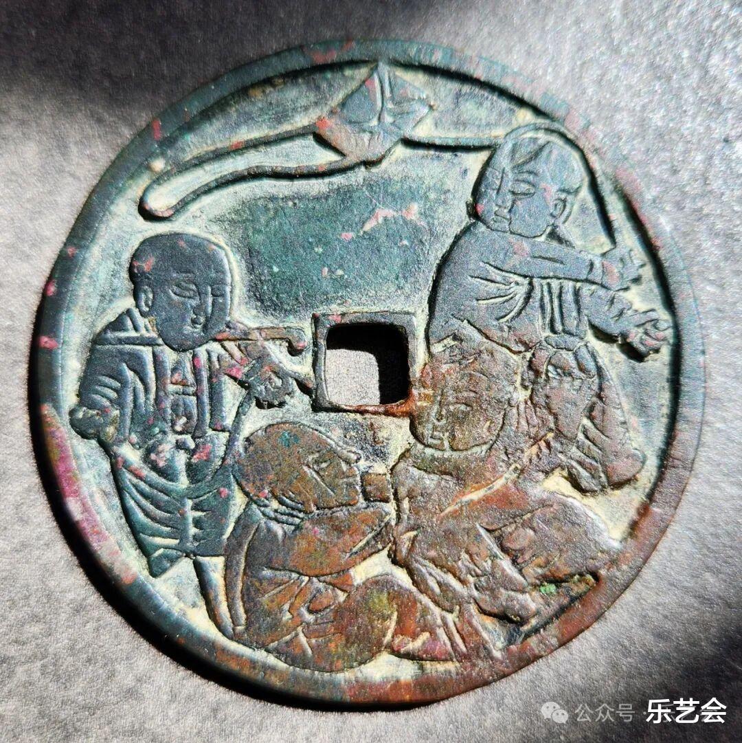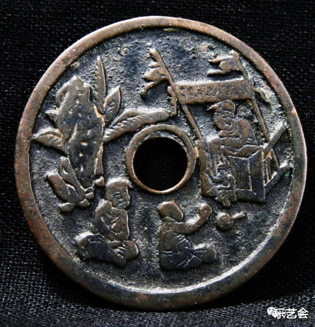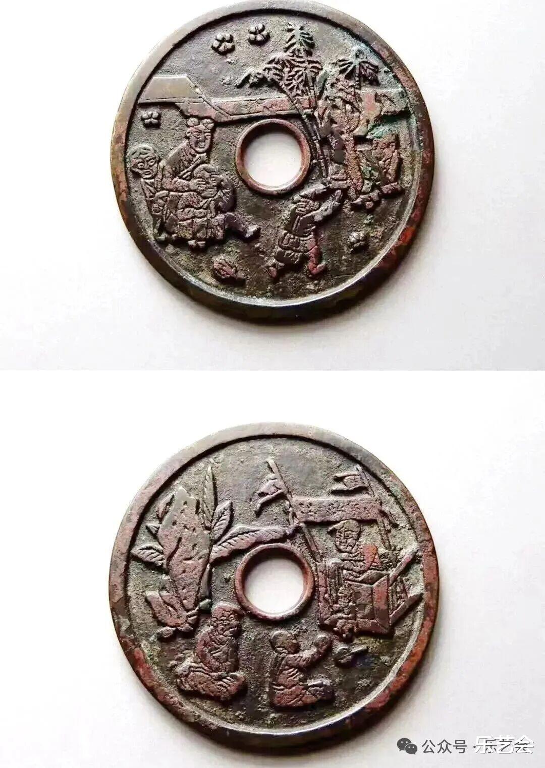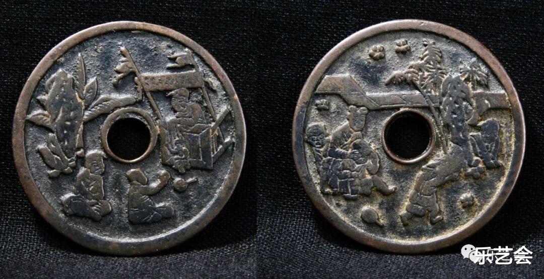 1、庭院嬉戏中的婴戏自玩宋代前后,庭院嬉戏,庭院婴戏的图例所在尤多。在花钱上也是如此。在庭院嬉戏的主题情态下,多数为小孩自己嬉戏,很少有大人的介入,尤其是男性成年人的介入。至于妇人加孩子的造型,那属于另一范畴,或表示慈母哺育,或表示多子庇护。比如鬼子母系列。在本文中我们不展开。