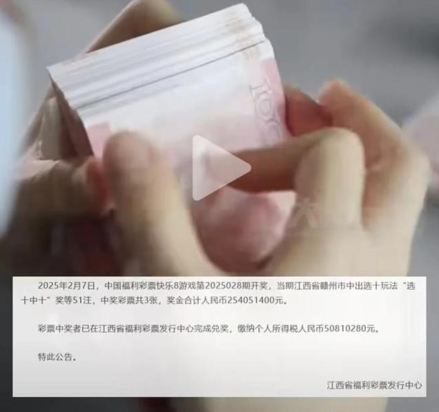近日中国福利彩票“快乐8”游戏开奖,江西赣州一彩民凭借三张彩票,狂揽“选十中十”玩法51注头奖,总奖金高达2.54亿元。更惊人的是,这51注全部出自同一家销售网点,中奖者随后火速完成兑奖,缴纳个人所得税5081万元后,带着2亿多元“潇洒离场”。