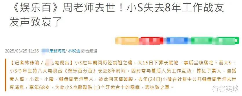 这已是《娱百》2025年痛失的第二位核心人物,年初大S因流感并发肺炎骤逝的阴影尚未消散,如今周老师离去更添唏嘘。