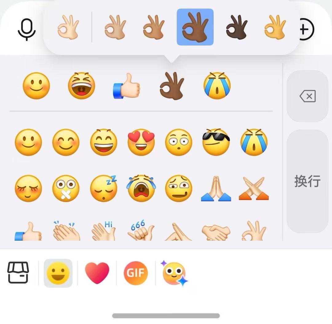 长按表情换肤:长按表情可选不同肤色,增加一点聊天的新鲜感。