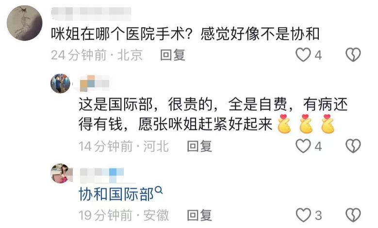 从细节中可以看到,张咪是在协和医院做的手术,身上穿着协和医院的病号服,而且还是在协和医院的国际部,相对来说费用比较高。