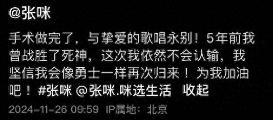 11月26日,歌手张咪更新了社交账号,这是她透露自己第3次患癌后首更动态,视频中她告知大家她已经做完手术,让大家不要太担心她,也谢谢大家的关心!