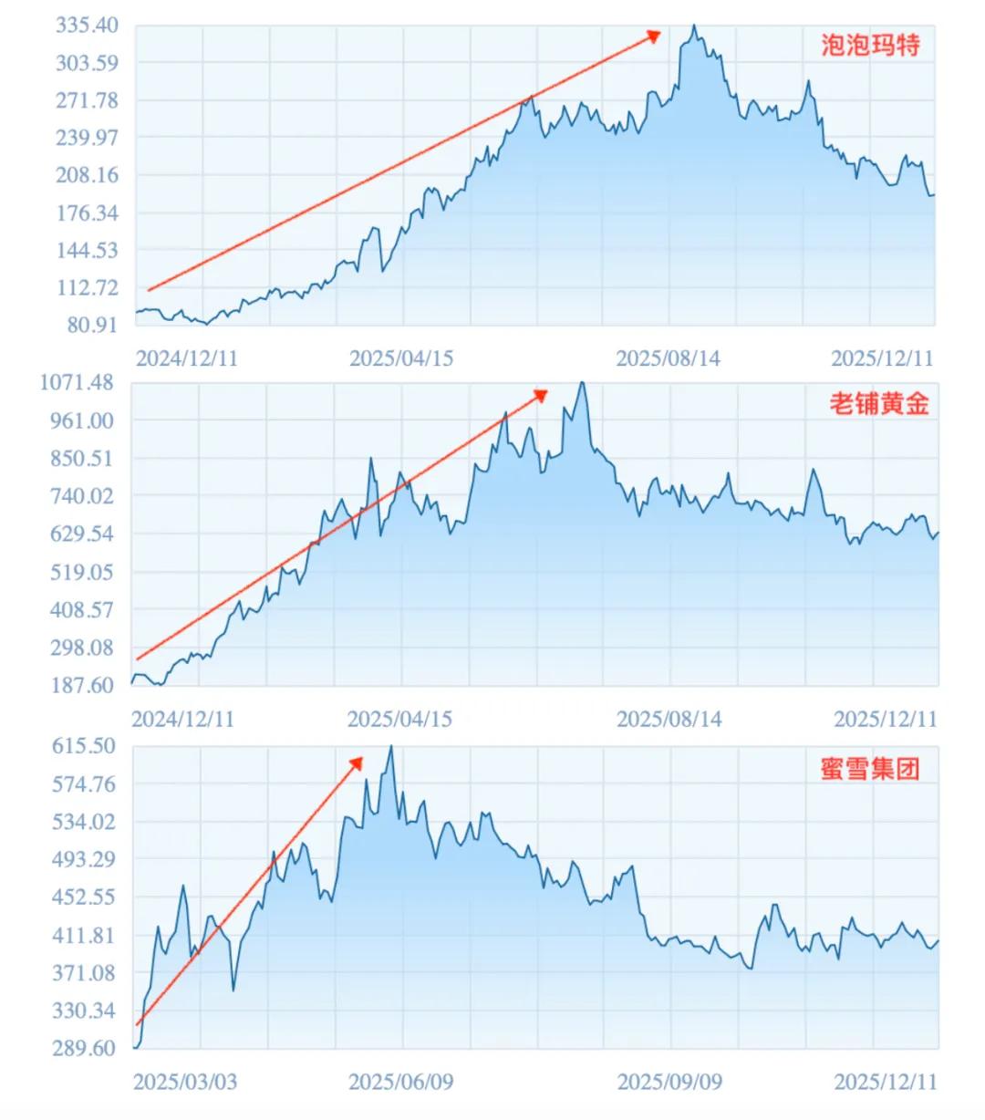 但今年,消费投资似乎有所回暖,甚至又开始出现机构抢项目的情况。这跟当年消费遇冷的节奏太像了:二级市场反向传导——2025年,“港股三姐妹”(蜜雪冰城、泡泡玛特、老铺黄金)的表现可圈可点,三家公司的总市值一度超7000亿港元,带动港股消费板块整体上行。同时还有沪上阿姨、古茗、布鲁可、霸王茶姬等明星公司成功IPO,让不少投资人大获丰收。