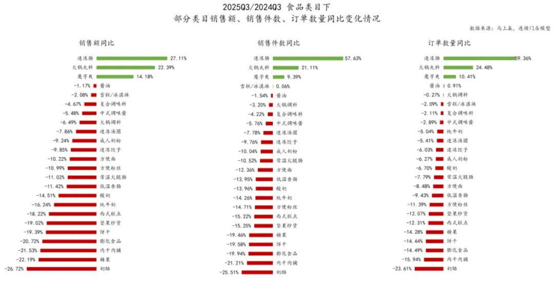 速冻肠、火锅丸料、魔芋爽 是少数在销售额、销售件数、订单数量上 均实现同比增长的类目 图源:马上赢品牌CT