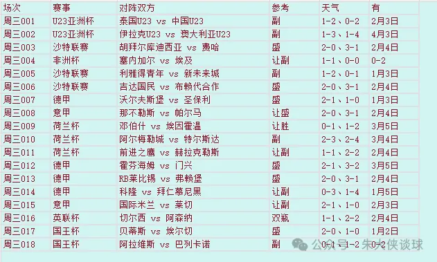 周三015 | 意甲国际米兰 vs 莱切⏰ 时间:01-15 03:45✅ 参考:让副📊 天气:2-1、1-0⚽ 有:2-3