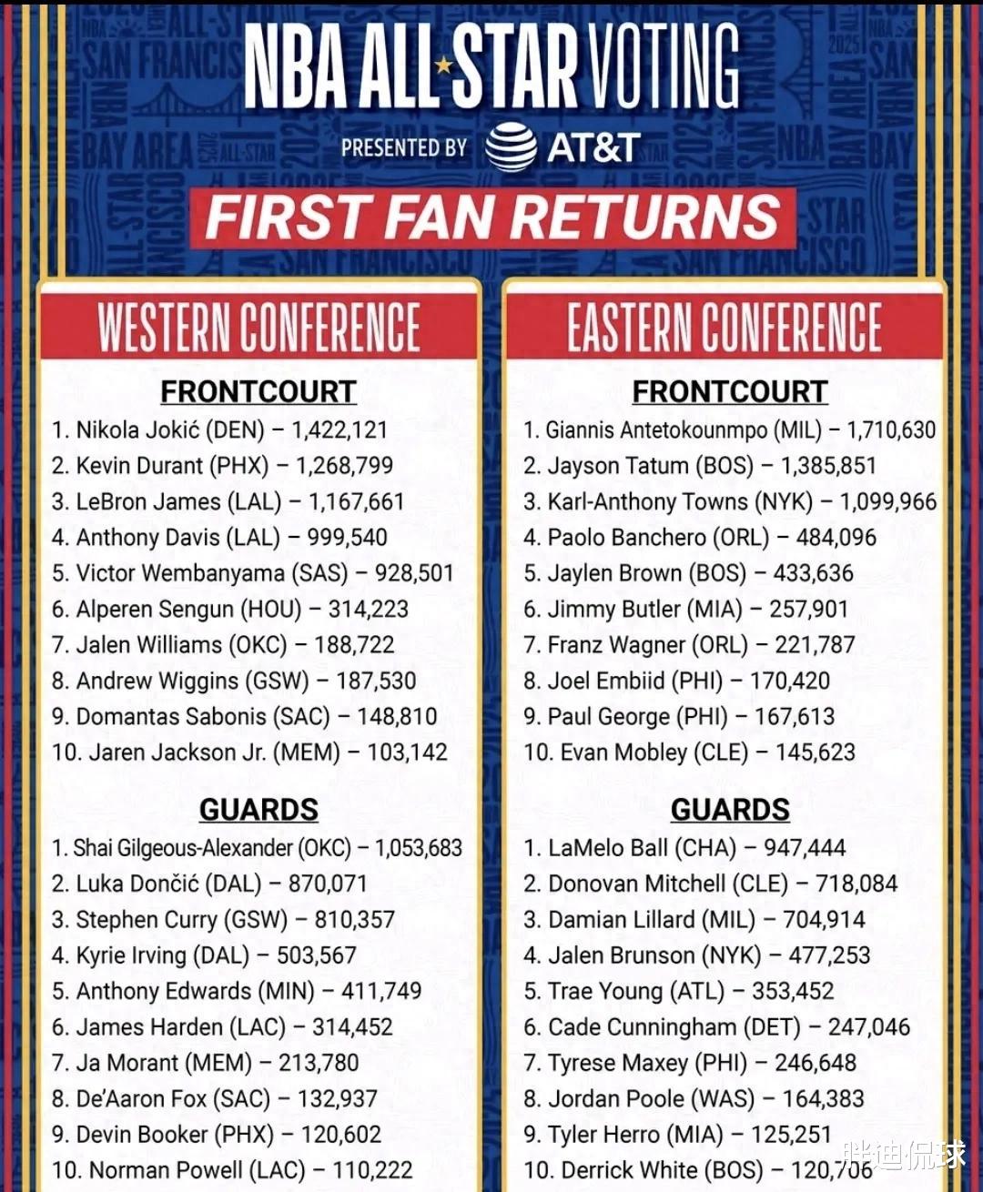 北京时间2025年1月3日,NBA官方宣布了2025年金州全明星第一轮投票的结果,其中东西部票王由字母哥和约基奇领衔。而在西部后场选票的排名中,而在西部后场选票的排名中,亚历山大以1053683票高居第一,而卢卡东契奇则以870071票位居第二,库里以810357票紧随东契奇之后,排名第三。排名第四的则是独行侠队后卫凯里欧文,他获得了503567票,与前三名的差距较大。排名第五的是森林狼当家核心爱德华兹,他获得了411749张选票。而快船当家后卫哈登收获了314452张选票,排名后卫榜第六位。