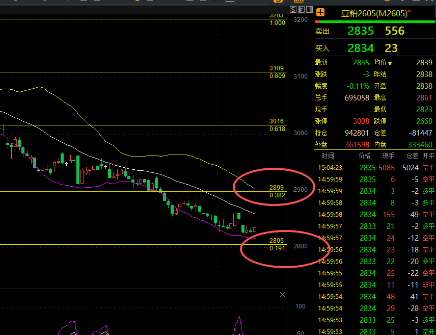 支撑位:第一支撑2830-2826元(日间低点+近期震荡下沿);强支撑2810元(多空分水岭,跌破后将下探2800)。