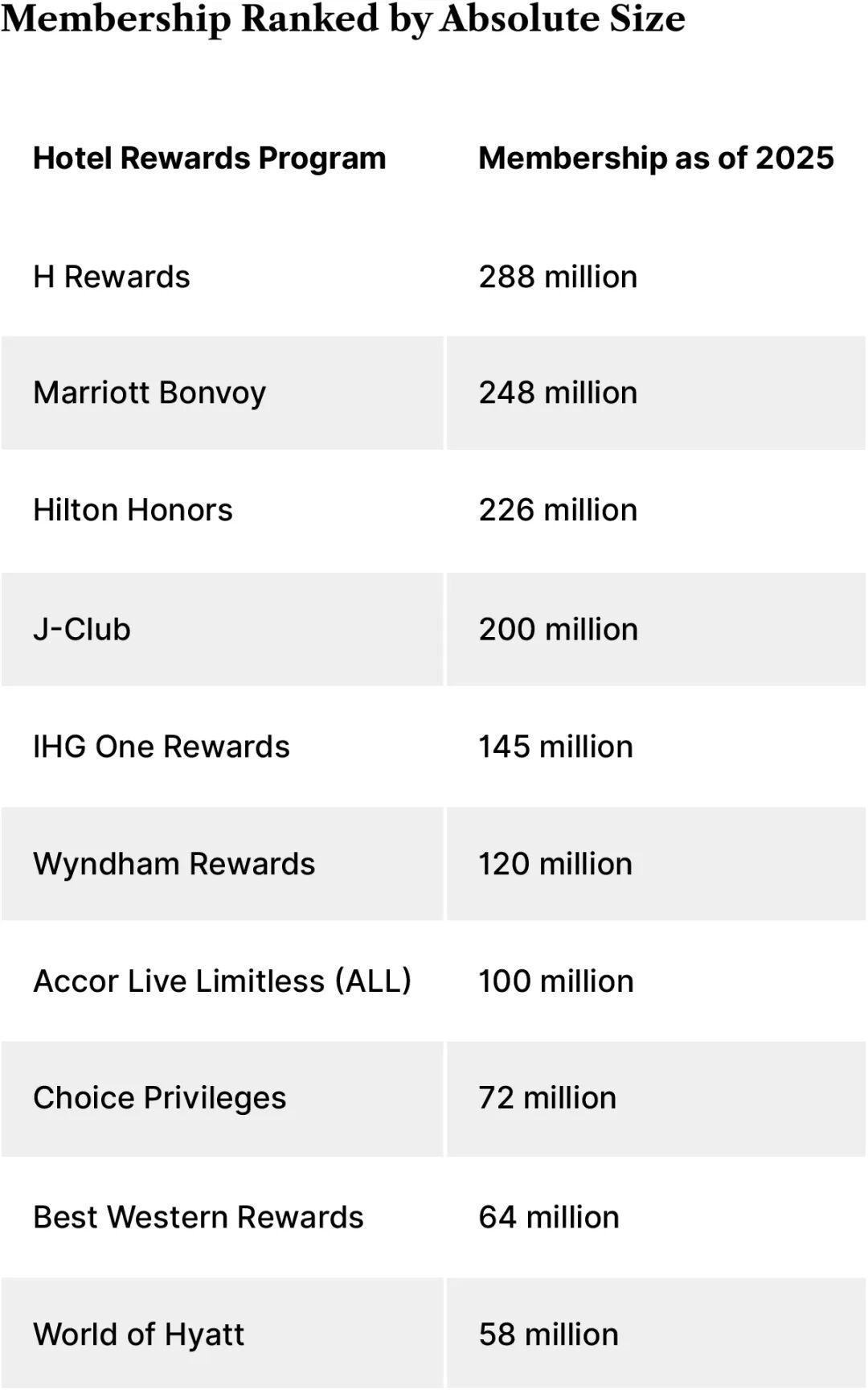 一是以“每间客房对应243位会员”的会员密度位居榜首,近乎翻倍领先于万豪(143位/客房),二是以2.88亿会员数,登顶酒店会员俱乐部会员总数全球第一。