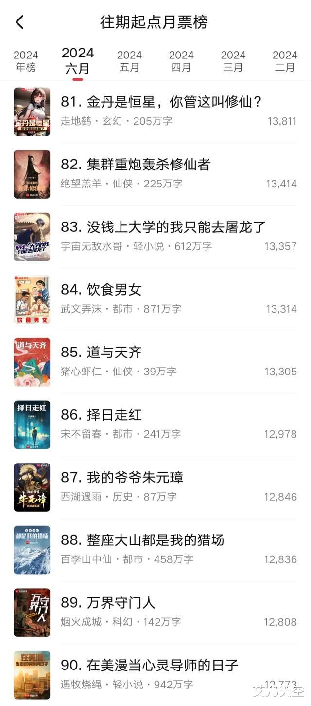 季越人的《玄鉴仙族》最后一天反超了踏雪真人的《法力无边高大仙》拿下了第十,中间也还闹出了一点风波。