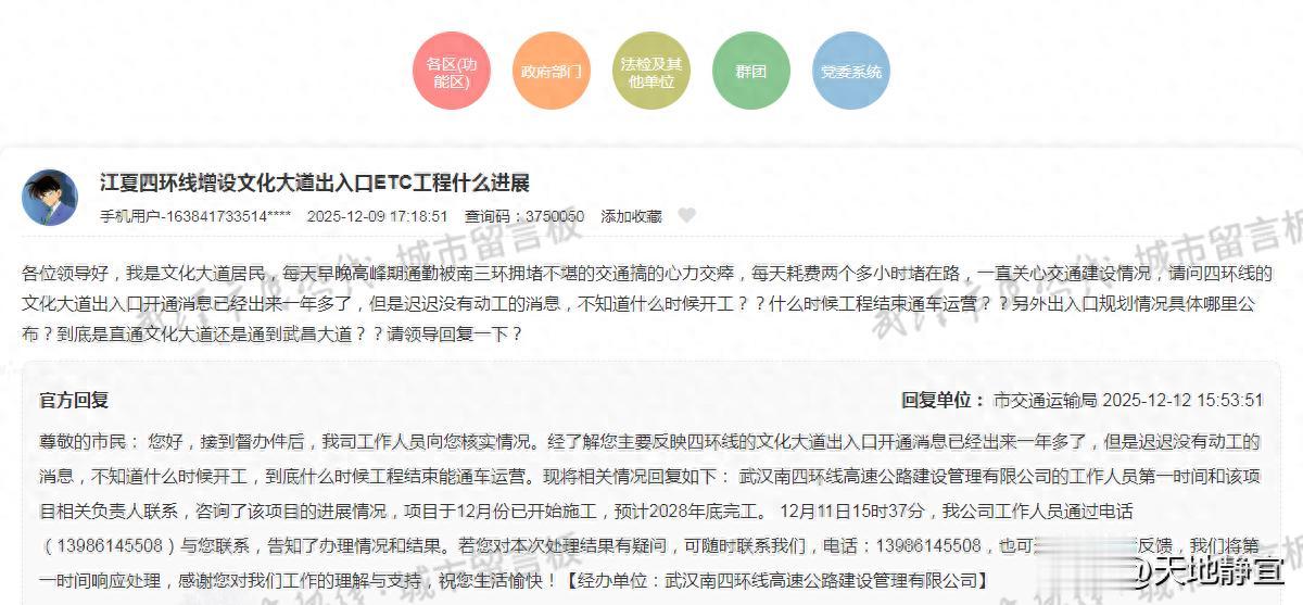 官方回复:经了解您主要反映四环线的文化大道出入口开通消息已经出来一年多了,但是迟迟没有动工的消息,不知道什么时候开工,到底什么时候工程结束能通车运营。现将相关情况回复如下: 武汉南四环线高速公路建设管理有限公司的工作人员第一时间和该项目相关负责人联系,咨询了该项目的进展情况,项目于12月份已开始施工,预计2028年底完工。