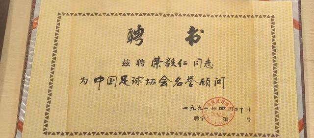 照片中就是当时他任职名誉顾问时所给他的聘书,上面还有中国足球协会的公章,虽然日常的工作非常繁忙,但是荣毅仁还是积极的处理了许多足协事务,甚至动用过自己荣氏家族的资金去帮助建设足协的各类奖项成立。