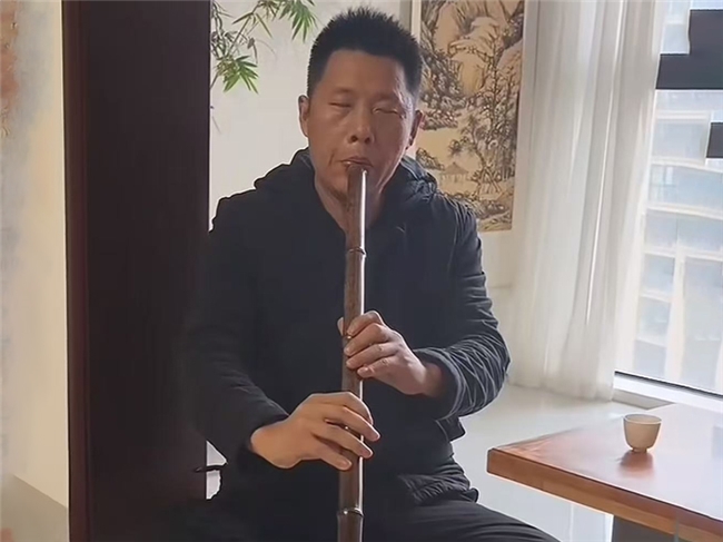 廖锦栋,字文松,是中国台湾著名的南管音乐家。他自幼浸润于竹乡文化环境中,深受传统艺术熏陶,不仅精通笛、箫的演奏与制作,还娴熟掌握多种丝竹乐器及月琴弹唱,兼具音乐实践与诗文修养。在制箫领域,廖锦栋将传统技法和当代美学相融合,创制出极具个人风格的“了然山人”箫。其中最出名的就是全长253厘米的八尺箫(CF调)与236.5厘米的七尺八箫(DG调)。这些巨箫不仅音律精准,还能支持四人同时演奏,场面恢弘,拓展了箫的表现形式与艺术边界。因此深受文人雅士和传统音乐爱好者的推崇。