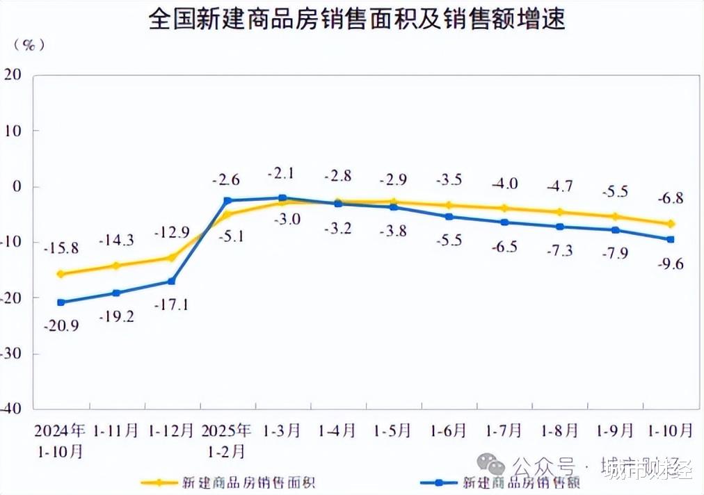 1至10月份,新建商品房销售面积71982万平方米,同比下降6.8%;其中住宅销售面积下降7.0%。新建商品房销售额69017亿元,下降9.6%;其中住宅销售额下降9.4%。