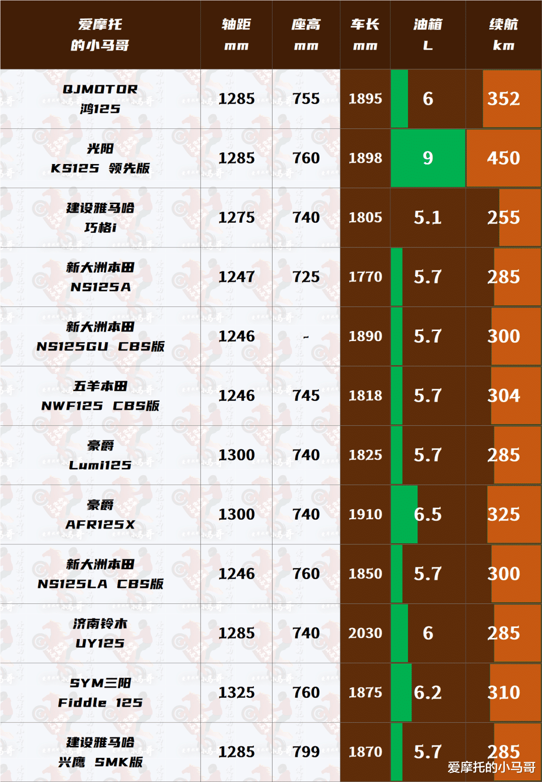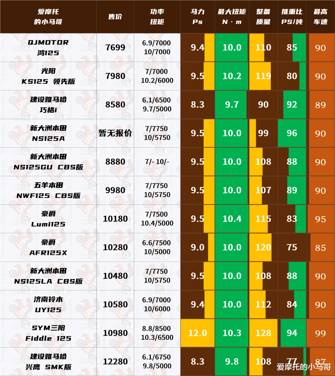 既然已经预上市了,小马哥也顺利拿到了它的核心参数,所以就收集整理了一下现在市面上销量比较好的同级别热门踏板进行对比,方便大家对它的动力平台能有个初步的了解。排名依据入门版本的售价来的,不同版本只在一些配置上有所差异,比较明显的就是制动辅助系统上,大部分标准版都是CBS或者裸奔状态,而想要ABS或者更高配置则普遍需要加价个1000~2000元不等,所以入门版本的价格也是很有意义的。
