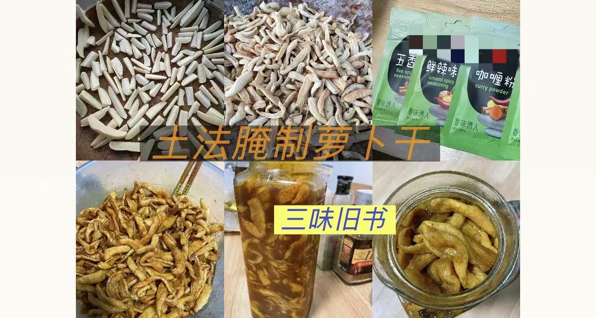 书中记载的这段关于腌制萝卜干的详细过程,其与南汇本地腌萝卜干方法相似,然所加的调料有所不同。我们在腌制萝卜干时不加橘皮,通常是加胡椒粉、咖喱粉之类的调料。