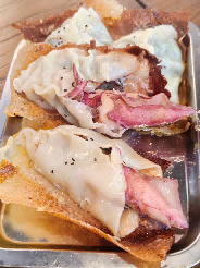 手工现包现煎,面皮筋道有嚼劲,煎至金黄酥脆,内里软嫩多汁,海鲜馅料新鲜扎实,拒绝添加多余调料,最大程度保留海鲜的本味,墨鱼馅Q弹紧实,虾仁馅鲜爽可口,必打卡。