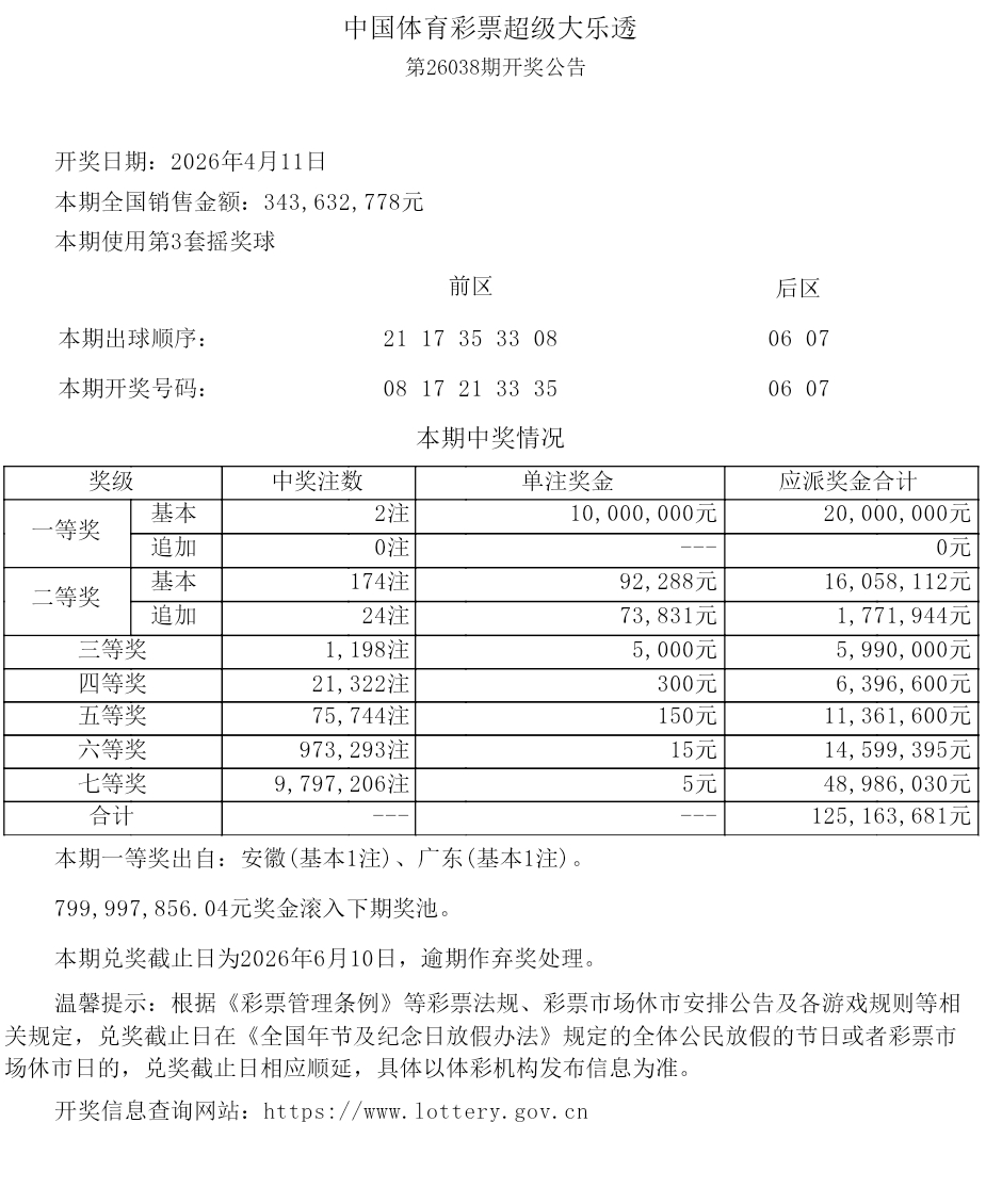 中体大乐乐2026038期开奖公告