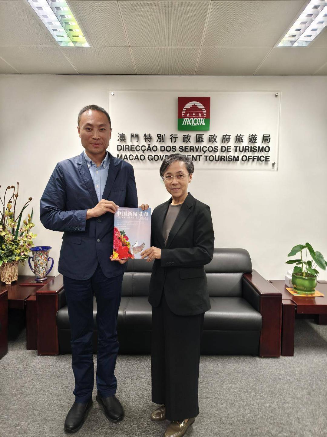 2025年10月31日,香港共工新闻社高级新闻顾问、中国新闻发布杂志策划、红刊杂志创始人黄光宇一行到访澳门旅游局座谈交流。黄光宇向澳门旅游局局长文绮华赠送了刊载题目为“小城大世界”:澳门走出特色文旅融合路——专访澳门旅游局局长文绮华文章的中国新闻发布杂志。