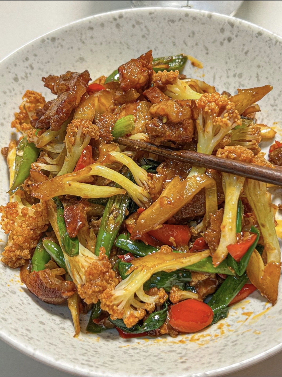 最后一步是点睛之笔。撒入一把蒜末和干辣椒段,快速翻炒十秒,蒜香与辣香瞬间激发,为这道菜增添层次感。蒜末的辛香能中和香肠的油腻,干辣椒的微辣则能刺激食欲,让咸香更突出。翻炒均匀后即可出锅,装盘时,焦香的香肠片裹着油亮的酱汁,脆嫩的花菜吸饱肉汁,每一口都带着咸鲜与脆爽的双重暴击。