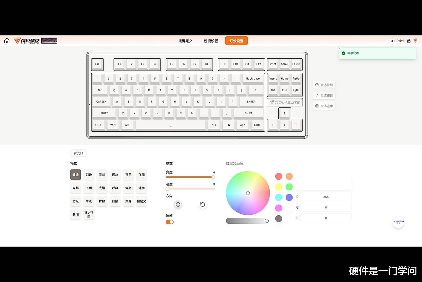 键盘默认彩色波浪灯效,除了驱动设置,也可以通过FN组合键来免驱设置,FN+↑↓调节灯光亮度,FN+←调节灯光方向,FN+→切换灯光颜色,FN+-和=调节灯光亮度,FN+\切换灯光模式。