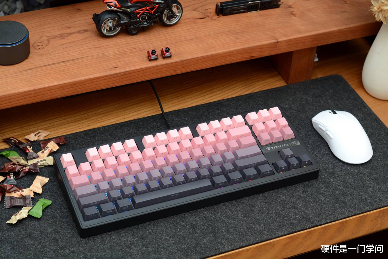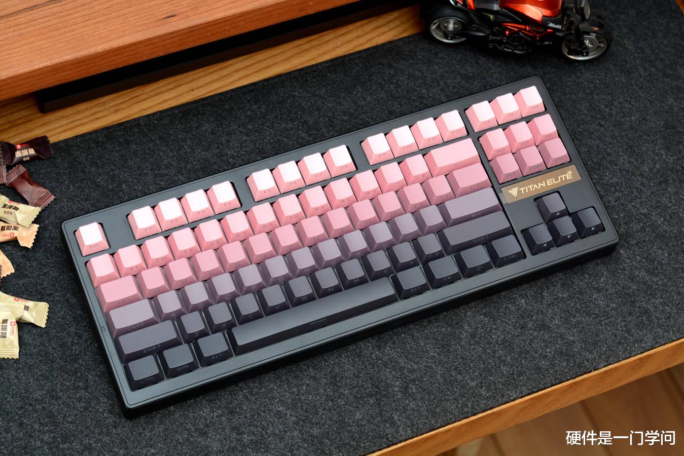 T87虽然价格很亲民,但分量不轻,拿快递时一只手提着都有点吃力。跟名称一样,键盘采用常规的87键布局,内嵌式设计,方向键上部贴有泰坦精英英文LOGO。我手上这款为黑莓粉配色,黑色外壳,搭配粉黑渐变键帽。