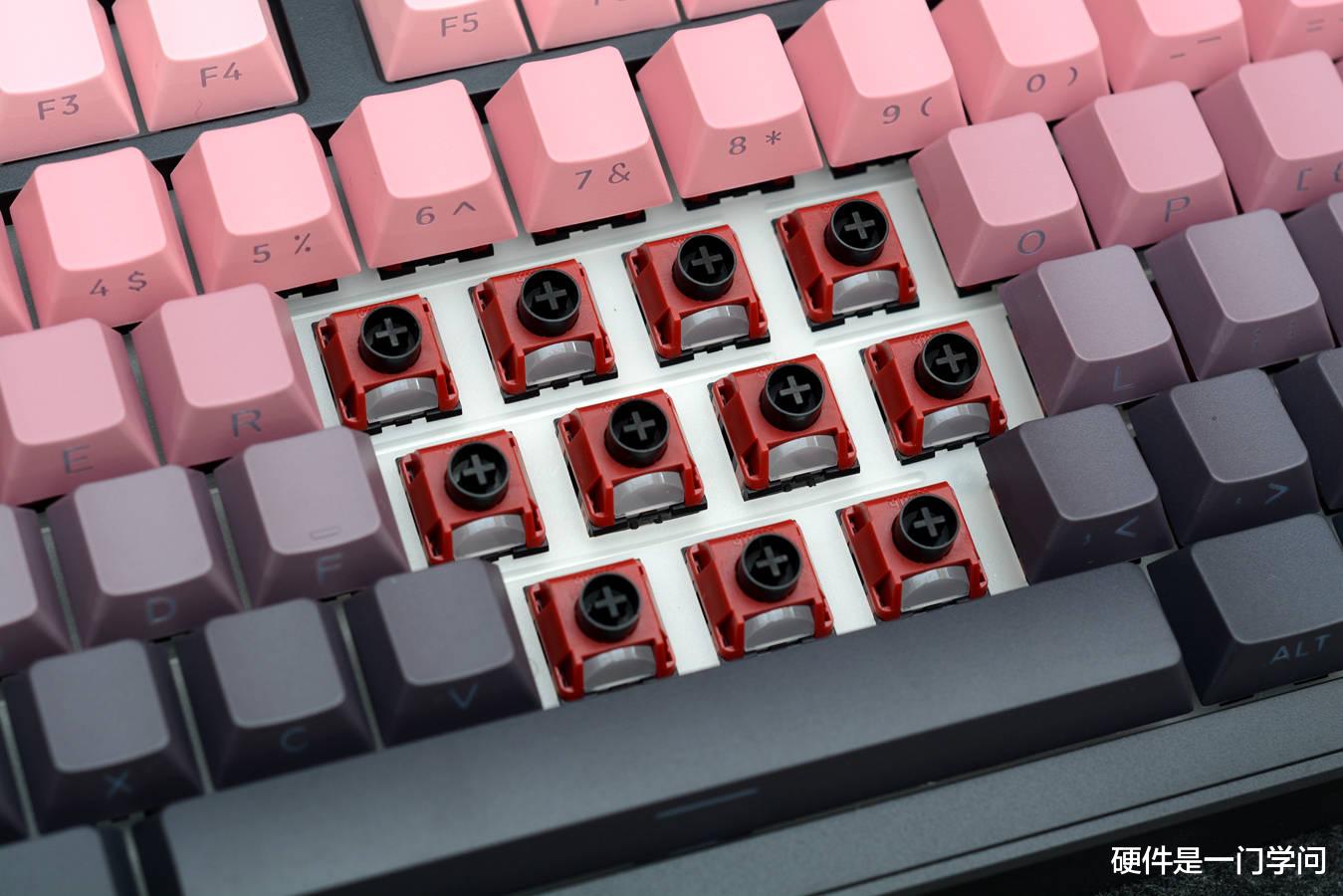 键帽采用PBT材质,双色注塑,原厂高度,侧透设计,粉黑渐变,颜色过度还是比较自然的,下面深色三行键帽需要开启灯光,字体才更清晰一些。