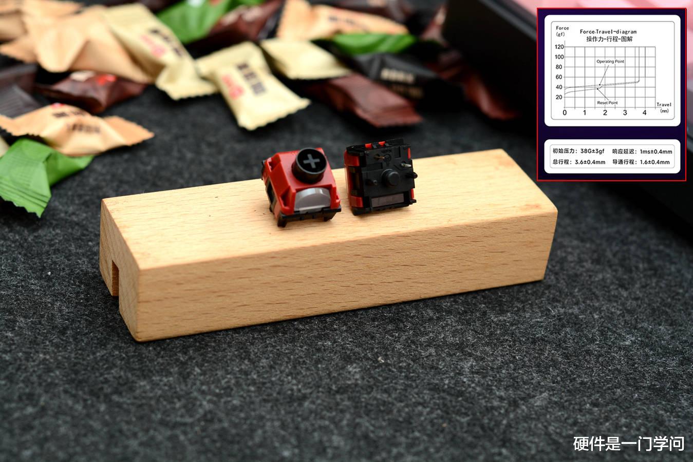 凯华MIX-5红轴采用红色POM上盖、黑色POM轴芯和黑色尼龙底座,以及雾透聚光镜,灯光更柔和均匀一些,底部采用五脚设计。轴体为线性手感,基本参数为38g初始压力,45g触发压力,1ms响应延迟,1.6mm触发行程,3.6mm总键程,设计寿命一亿次。
