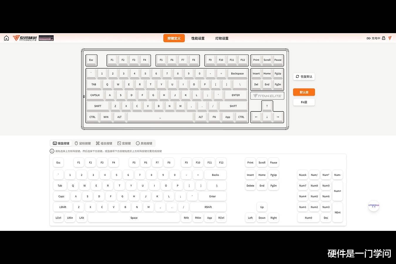 T87采用了实现流行的网页驱动方案,驱动界面比较简洁,分为按键定义、性能设置、灯光设置三个版块。按键定义,可以进行改键、鼠标按键、组合键、宏按键、多媒体键等设置。