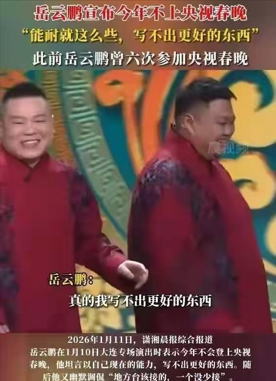 就在大家议论纷纷、云里雾里的时候,1 月 10 日的大连相声专场上,岳云鹏终于给出了板上钉钉的答案。他直言不讳地表示,今年铁定不上央视春晚了,原因很实在 ——“能耐就这么多了,实在写不出更好的东西了”。