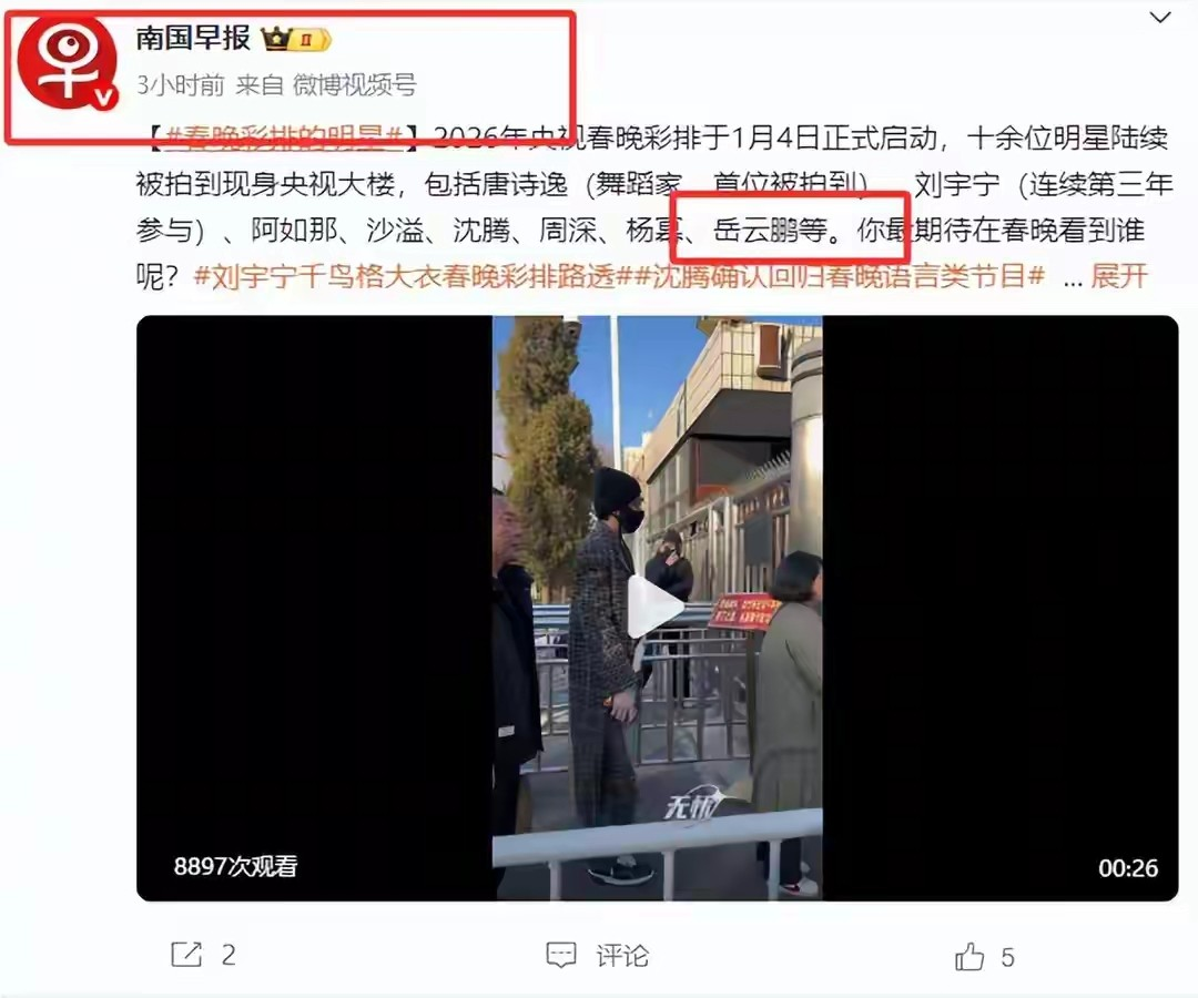巧合的是,春晚彩排的节骨眼上,岳云鹏正在东北赶线下相声专场。
