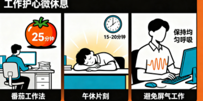 • 避免“屏气工作”:在处理复杂问题时,注意自己的呼吸,不要不自觉地憋气,保持呼吸均匀深长。