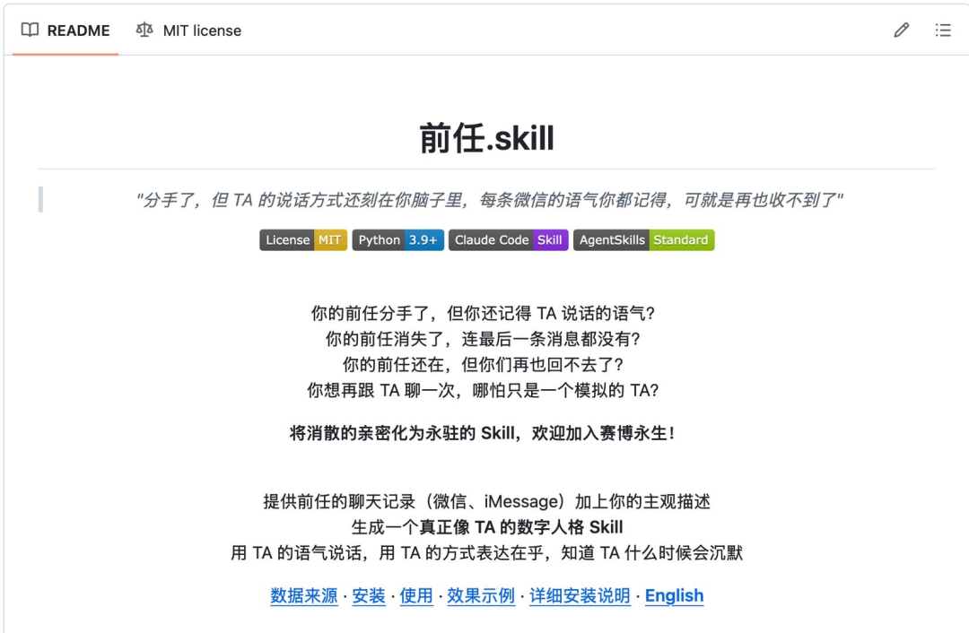 “前任.Skill”成了另一个现象级爆款。支持直接解析微信聊天记录导出的数据库文件。
