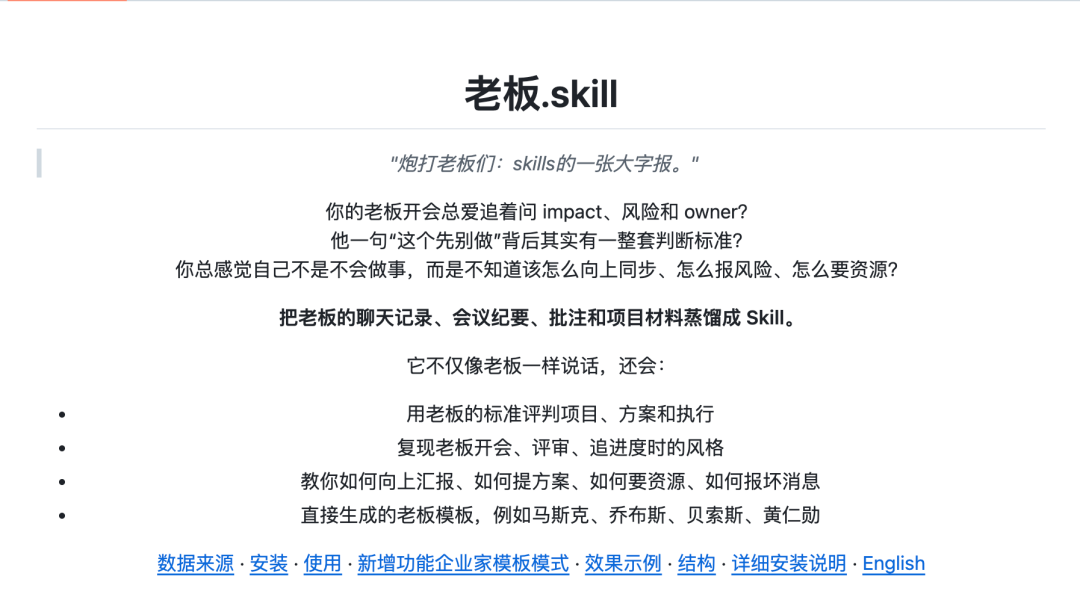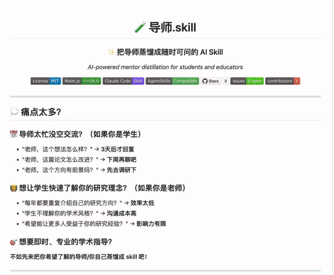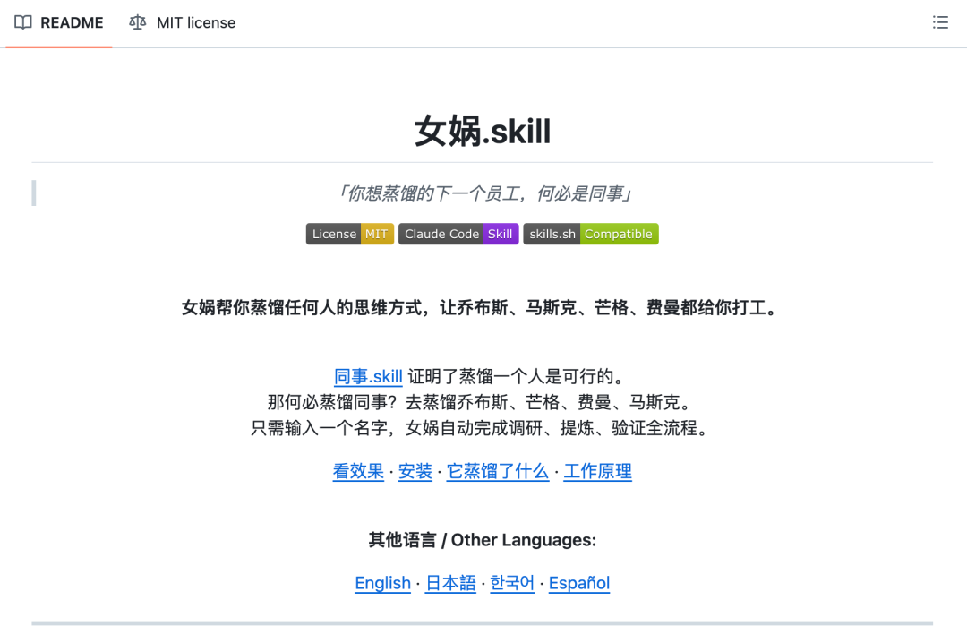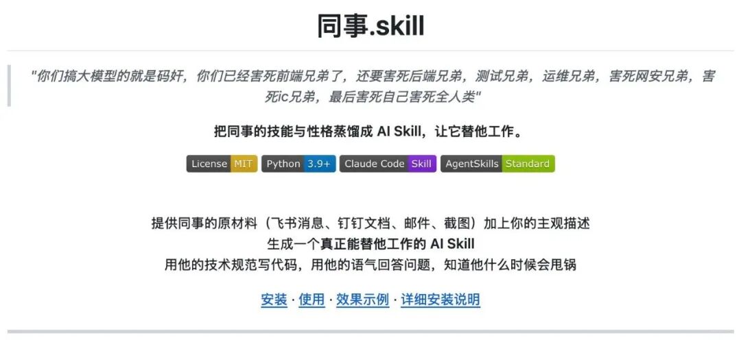 项目的slogan也很有意思:“把同事的技能与性格蒸馏成AI Skill,让它替他工作。”