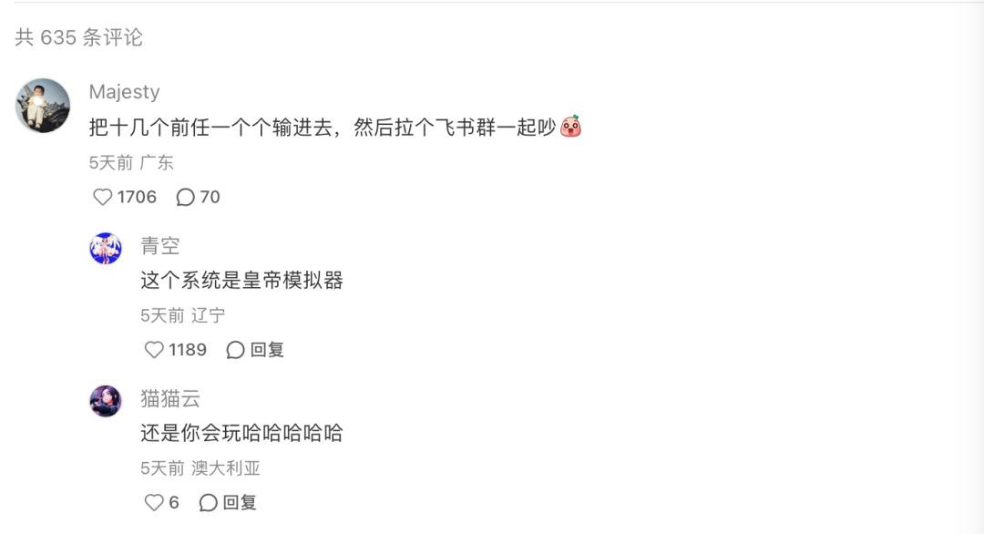 社交平台上还有大聪明提议:把十几个前任一个个输进去,然后拉个飞书群一起吵!