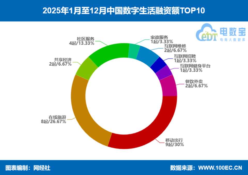 融资事件数维度,移动出行 9起占比 30% 居首,在线旅游 8起占比 26.67% 次之,两者合计占比超 56%;社区服务 4起占比 13.33%,共享经济、餐饮外卖均为 2 起各占 6.67%,家政服务、互联网招聘、互联网健身平台均仅 1 起各占 3.33%,赛道热度与融资总额高度匹配。