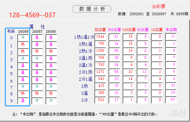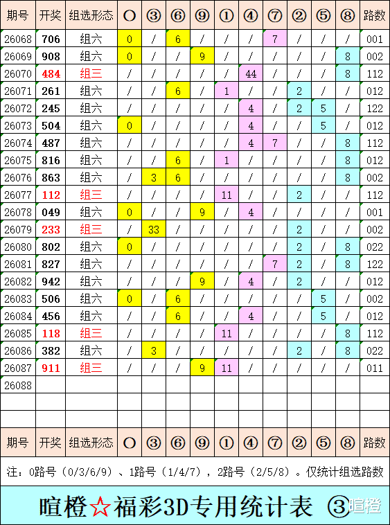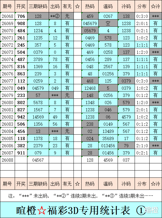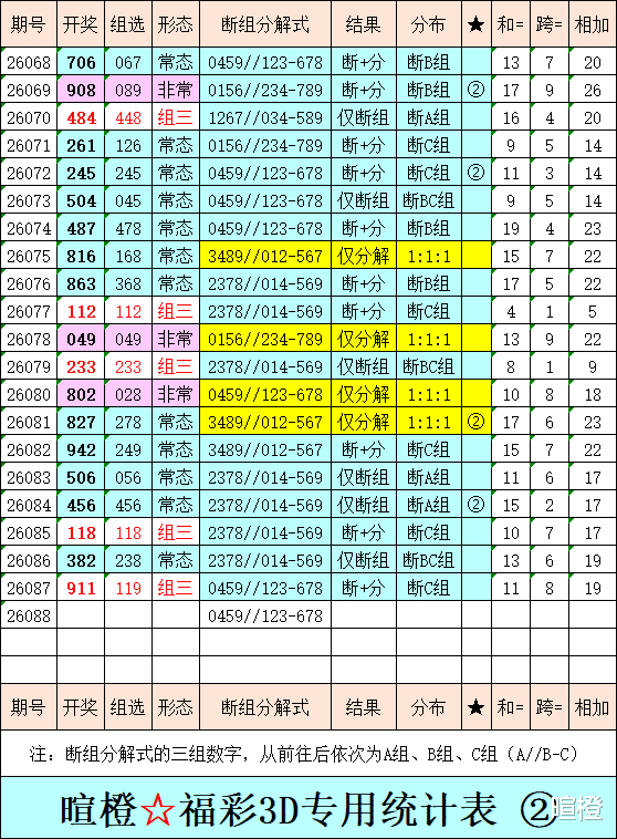 26088期:暄橙福彩3D综合条件(本期将在4月8日21:15开)一、上期回顾 ☆1、上期开奖号:9 1 1。2、和值= 11,跨度= 8。3、组三形态,011路组合。4、热度分布(热:温:冷)0:2:1。二、本期条件 ☆1、三期缺码:04567。2、热:128,温:4569,冷:037。3、断组分解式:0459//123-678。4、四胆:1457;三胆:157。三、术语解释 ☆1、三期缺码:0至9这十个自然数当中,未在近三期开奖号出现的数字。2、热度(热温冷):自然数0至9,在近七期开奖号中,出现3次及3次以上的数字,称为热码;出现2次的数字,称为温码;出现1次和未出现的数字,称为冷码。某个数字在开奖号中出现几个,就按几次计算。3、断组分解式:将0至9这十个自然数,分成三组数字,从前往后依次为A组(4码)、B组(3码)、C组(3码),一般情况下,有一组数字不出码,偶尔会有两组数字不出码。A组不出码的情况相对较少。断组为主,分解为辅。4、常态组六号码:同时包含大数、小数、奇数、偶数、质数、合数的组六号码,共有72注。统计表中,简称“常态”。5、非常态组六号码:全大数、全小数、全奇数、全偶数、全质数、全合数等六种形态的组六号码,共有48注。统计表中,简称“非常”。★提醒:彩市有风险,参与须谨慎!水平有限,仅供参考!