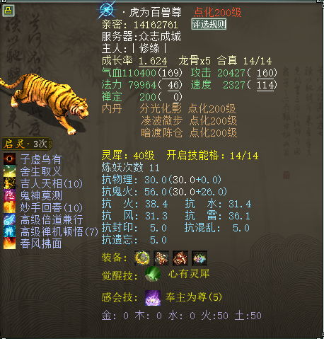 这是修缘的老虎,满级满灵犀带子虚乌有终极技能,另外亲密是1416万,觉醒技及感会技都很到位,值得给大家分享出来养养眼。
