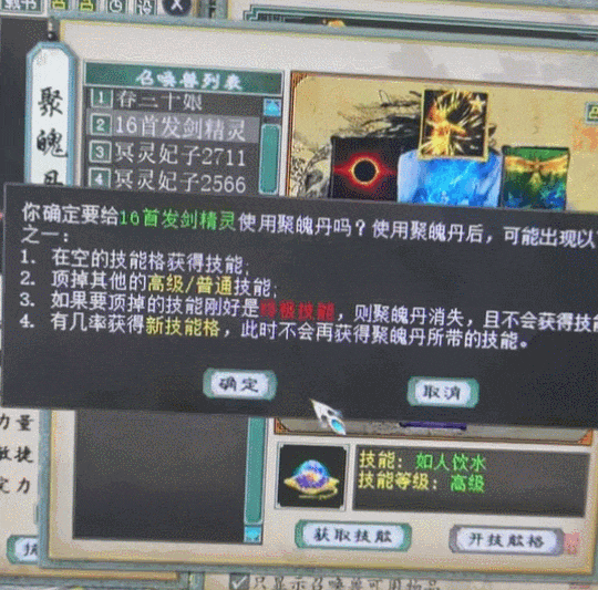 玩家给子虚剑精灵吃克水聚魄丹,开吃前默念千万别顶神出,结果把小春给顶掉了,实在是可惜。