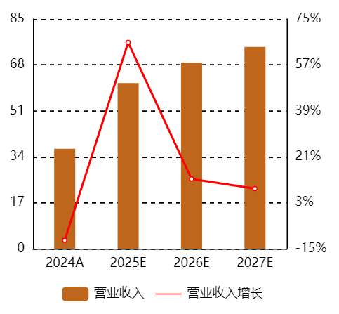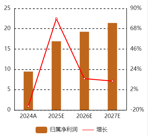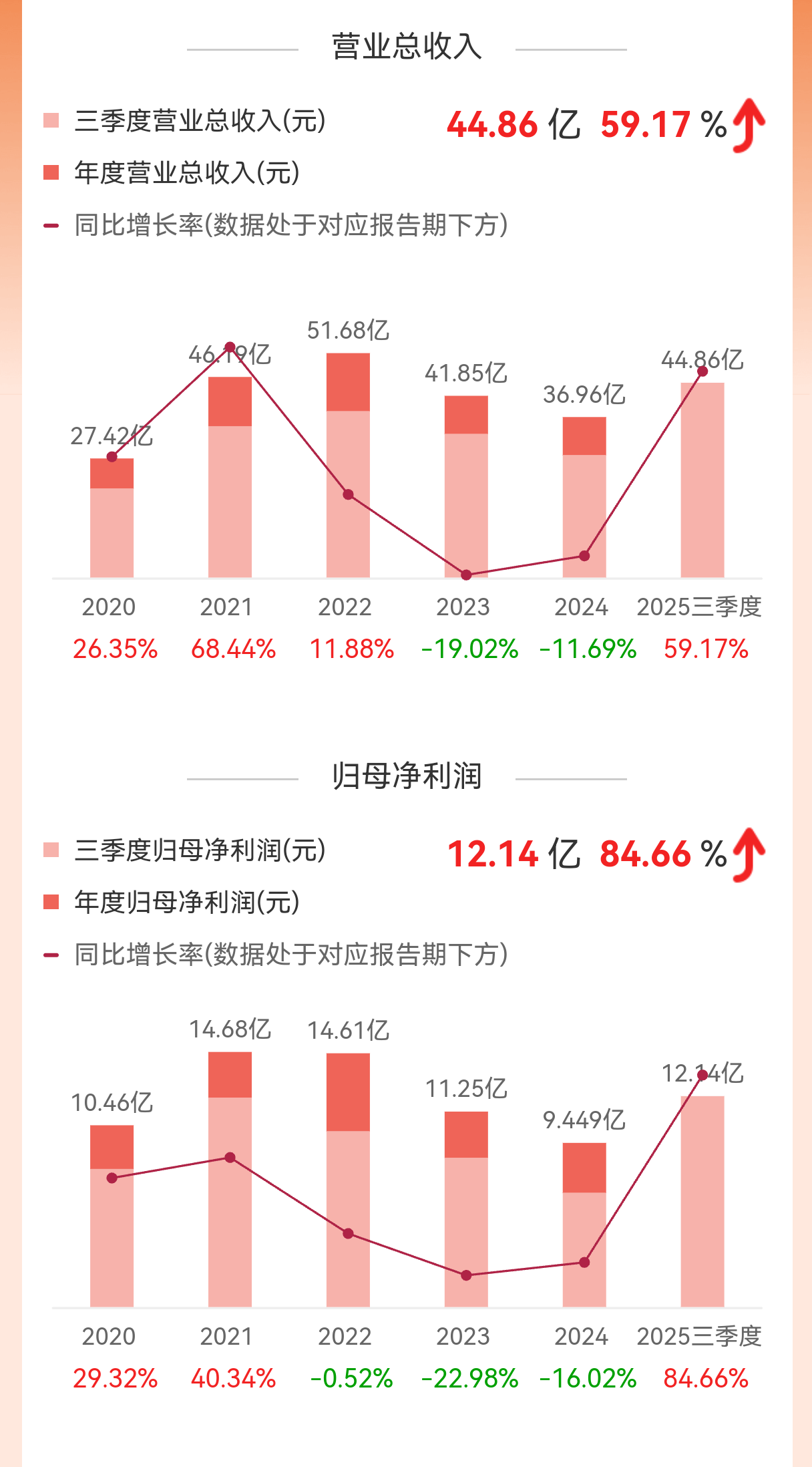 3、盈利分析与预测根据2025年三季报数据,该公司实现营业收入44.86亿元,同比增长59.17%;归母净利润12.14亿元,同比增长84.66%。从下面的走势图可知,在经历2023年、2024年的业绩下滑后,2025年呈现强势复苏和增长态势。