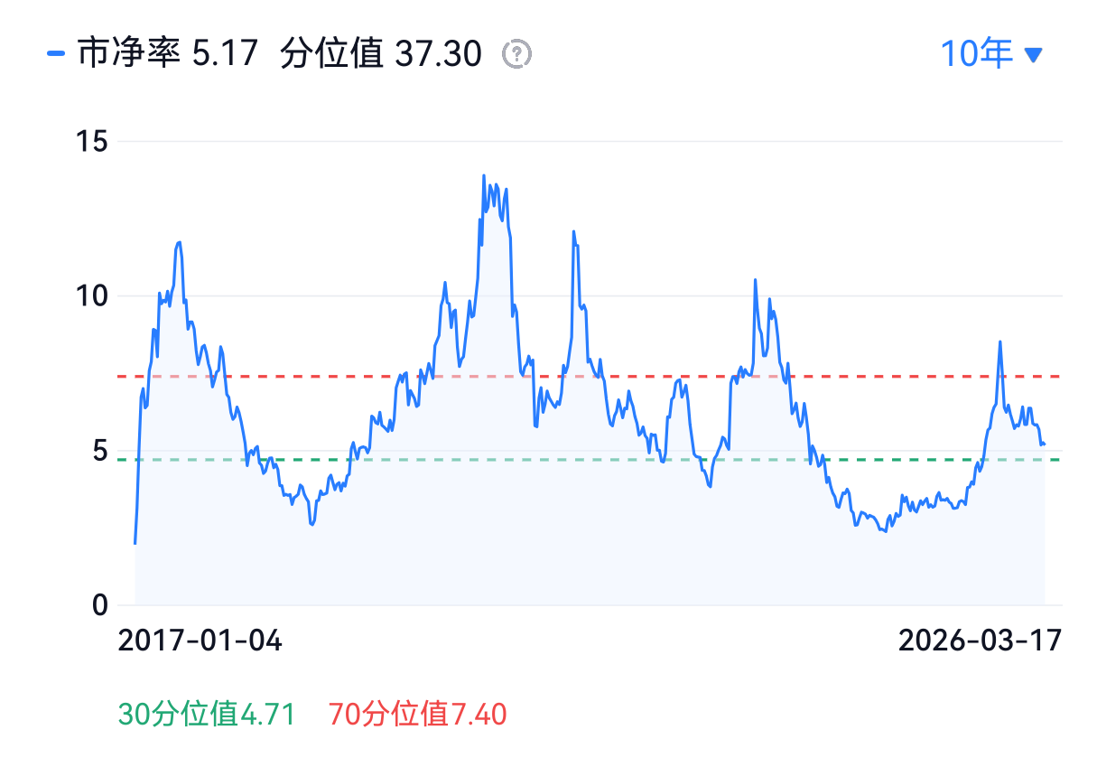 市净率也处于近10年的相对低位,分位值为37.3,也是处于相对低位,既没有低估也没有被高估。