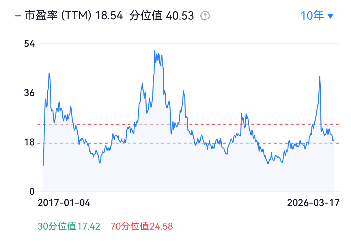 市盈率处于10年来的相对低位,分位值为40.53,不能算特别低估,当然更没有被高估。