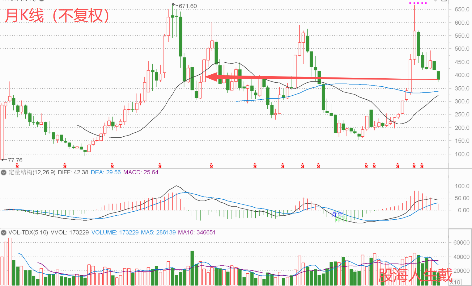 再看月K线趋势,该股自上市以来价格总体是向上运行的,但区间起伏波动剧烈。从上市首日的77元,一路拉升至376元,最大涨幅388%。2017年3月至2018年10月,又从376元跌至92元,最大跌幅75.5%。接下来又是大幅上升,2018年10月-2020年8月,从92元涨到671元,最大涨幅达629%。随后又经历了几次腰斩和翻倍行情,直至2024年7月-2025年9月的4倍向上行情。