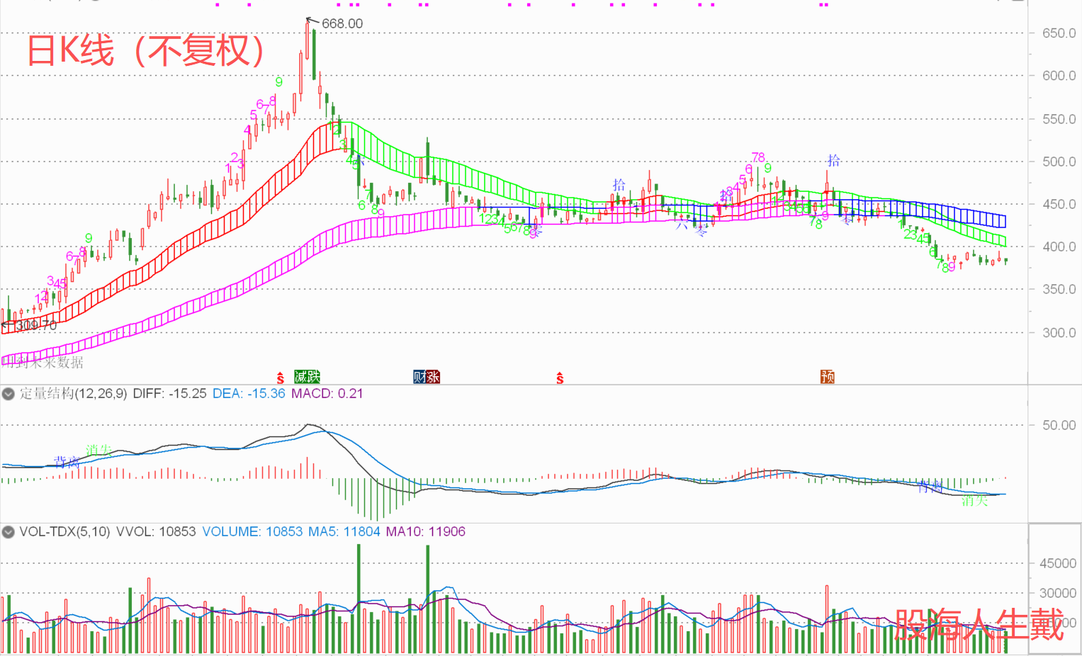 总之,该股价格弹性非常大,周期振幅巨大。买在高点,容易造成50%以上亏损。买在低点,也容易获得翻倍甚至以上浮盈。虽然该股价格回到了5年前,但从去年9月的668元高点到383元,跌幅未达到50%,在趋势未走好之前,仍需谨慎。如果股价突破主要趋势线,或是MACD指标出现底部结构,可重点关注。