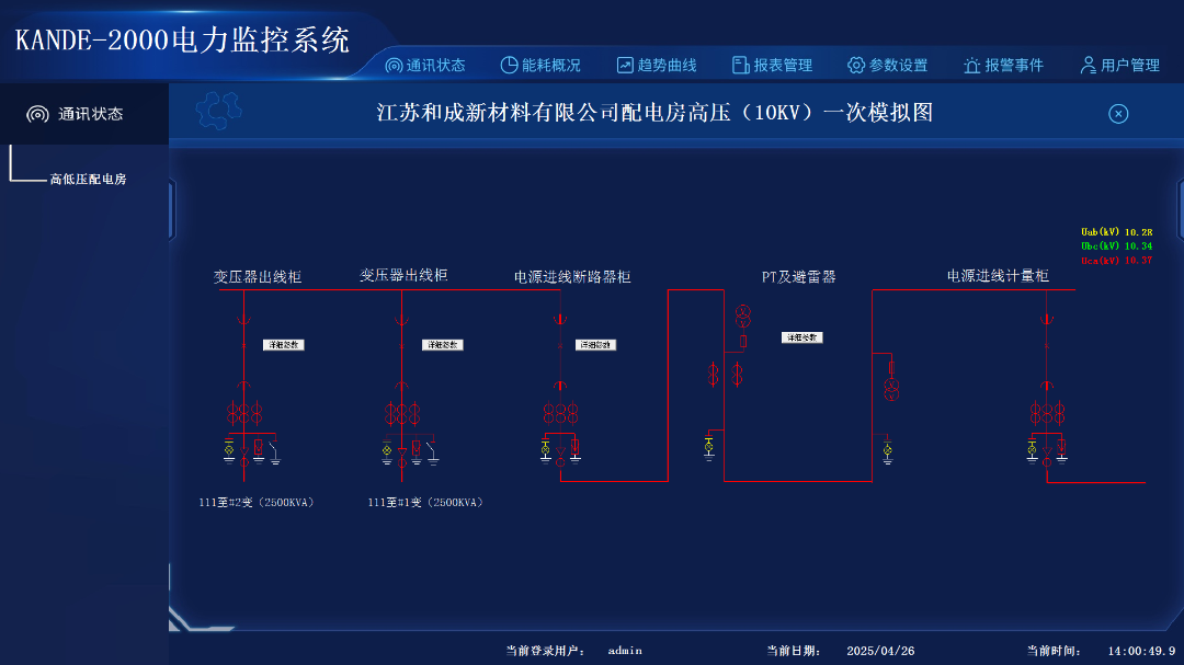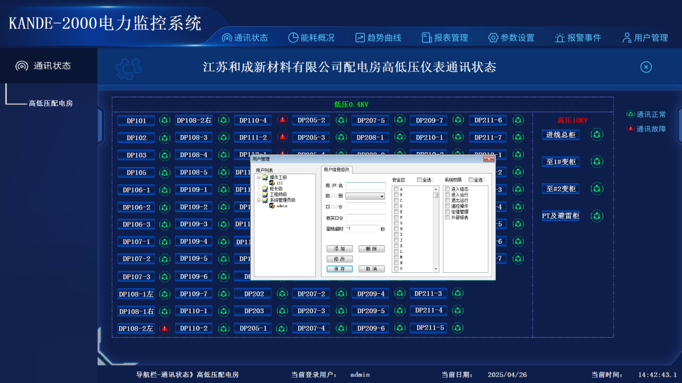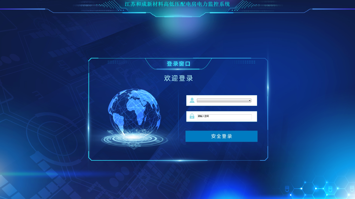 系统开机后点击桌面上的“江苏和成新材料有限公司配电房电力监控系统”快捷图标进入界面,选择用户名,输入密码点击登录即可进入运行系统。